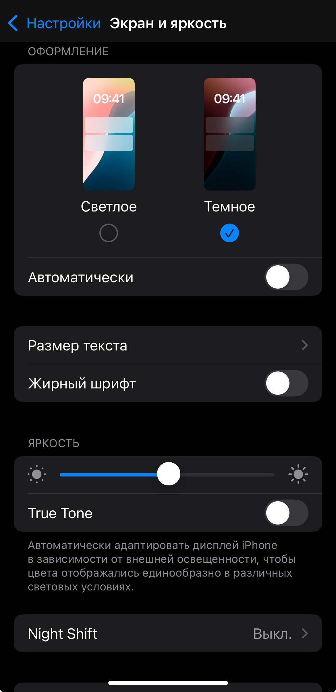 — устанавливаем тёмное оформление, при этом ниже отключаем «Автоматически»